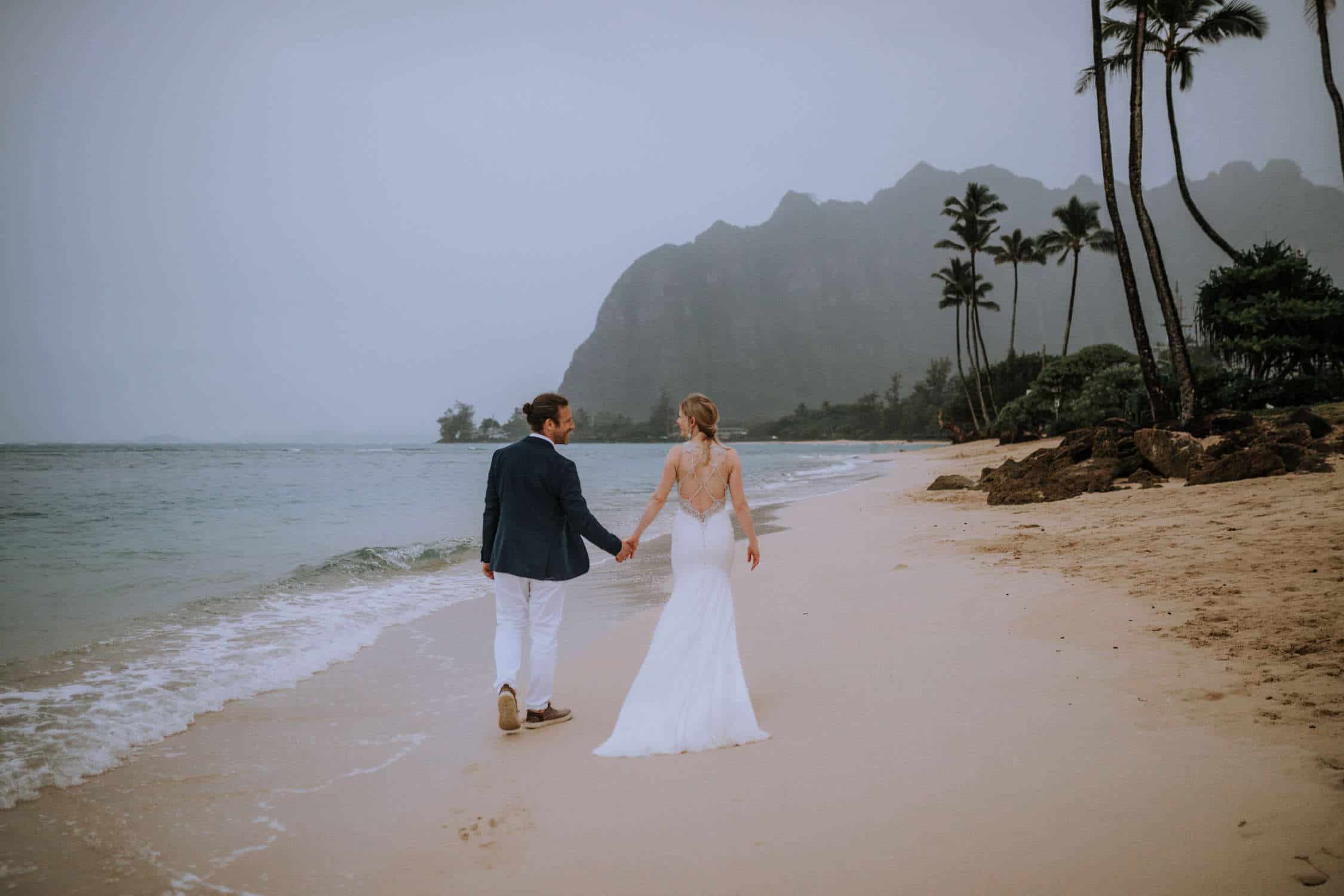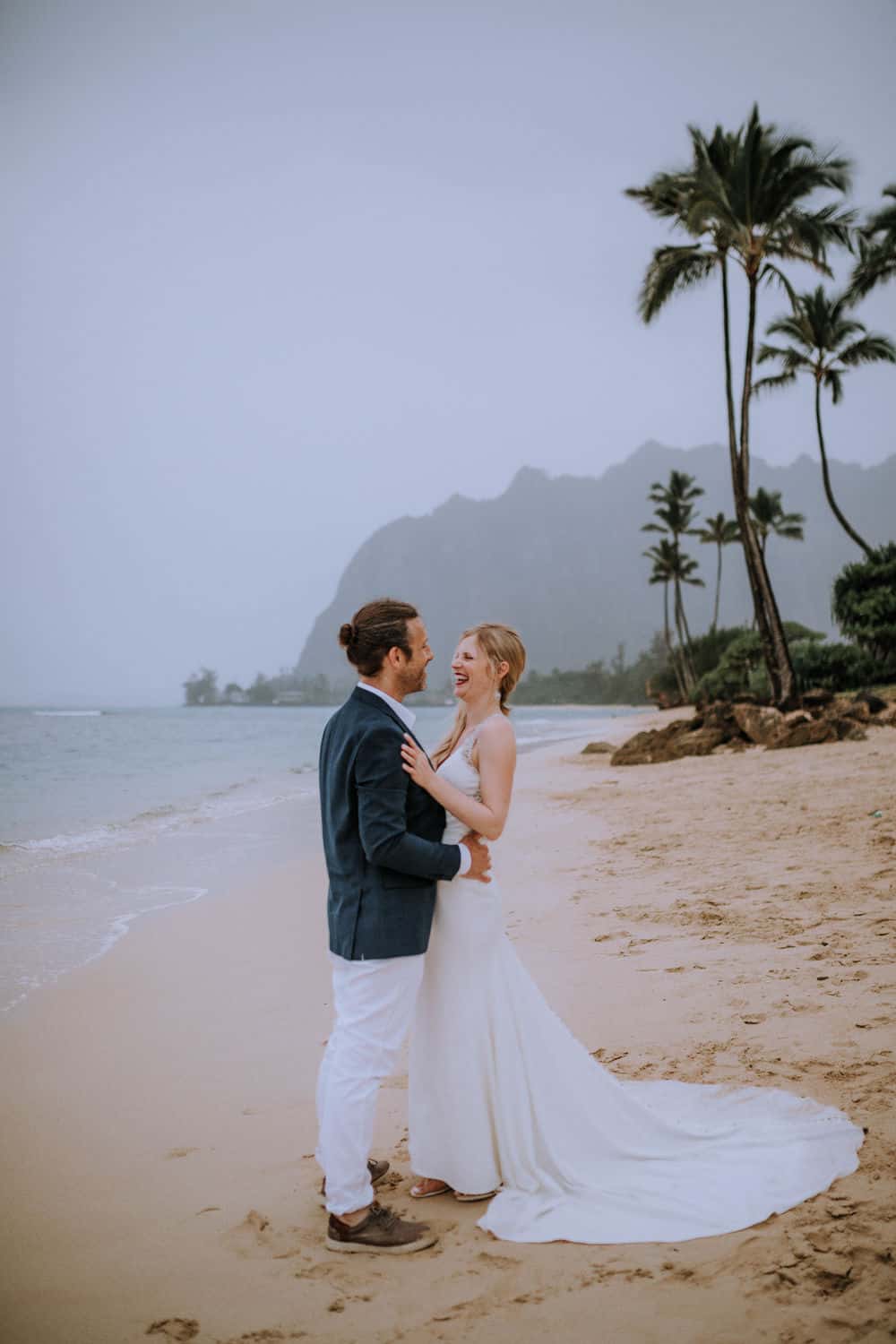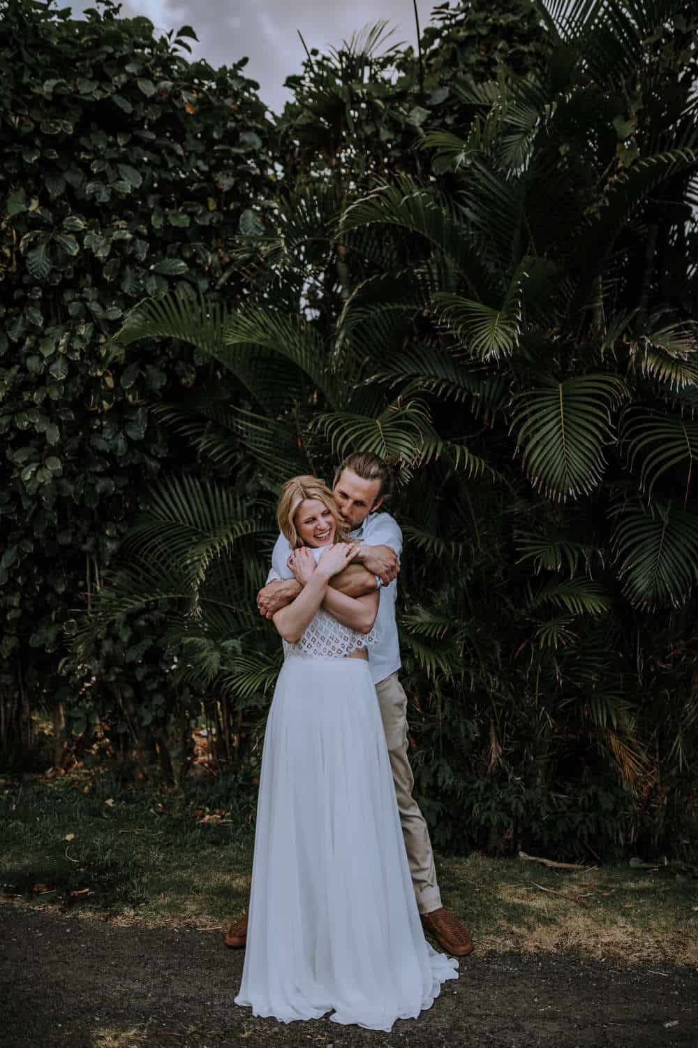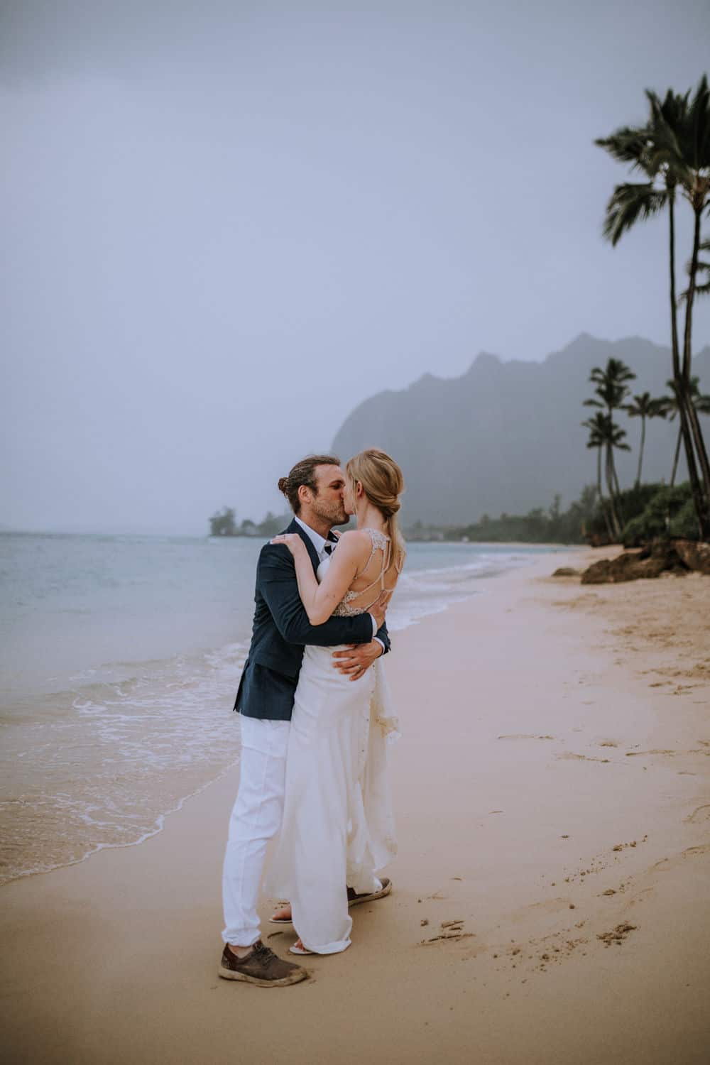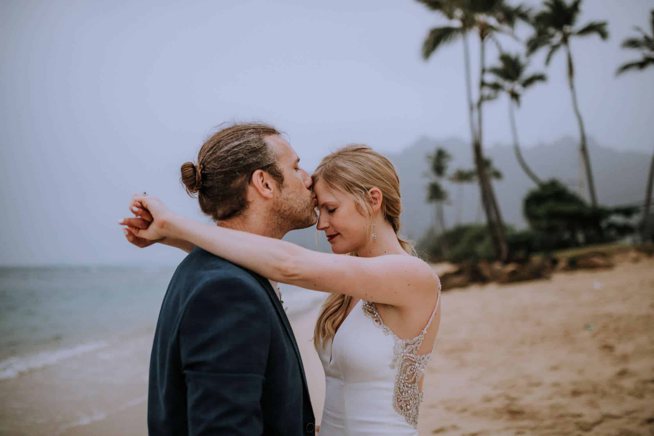 Having this all come together after planning for so long was such a dream come true for these lovers! They had friends & family travel from afar to witness their Elopement at a private home in Kaaawa. Stefanie & Joseph were a super laid back couple, down for whatever, wanted to head to the beach for photos in the pouring rain and had drinks + a dance party with their guests!