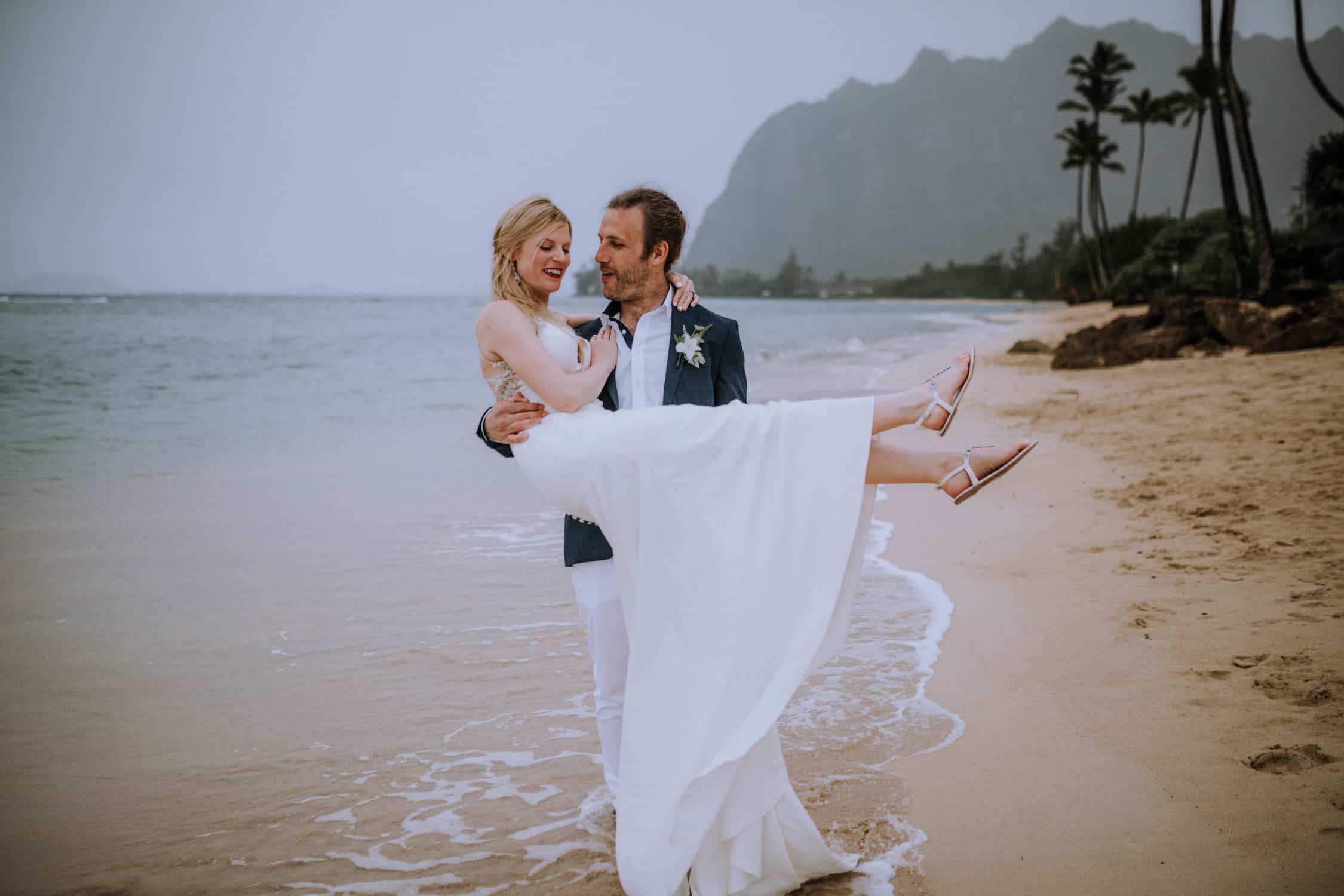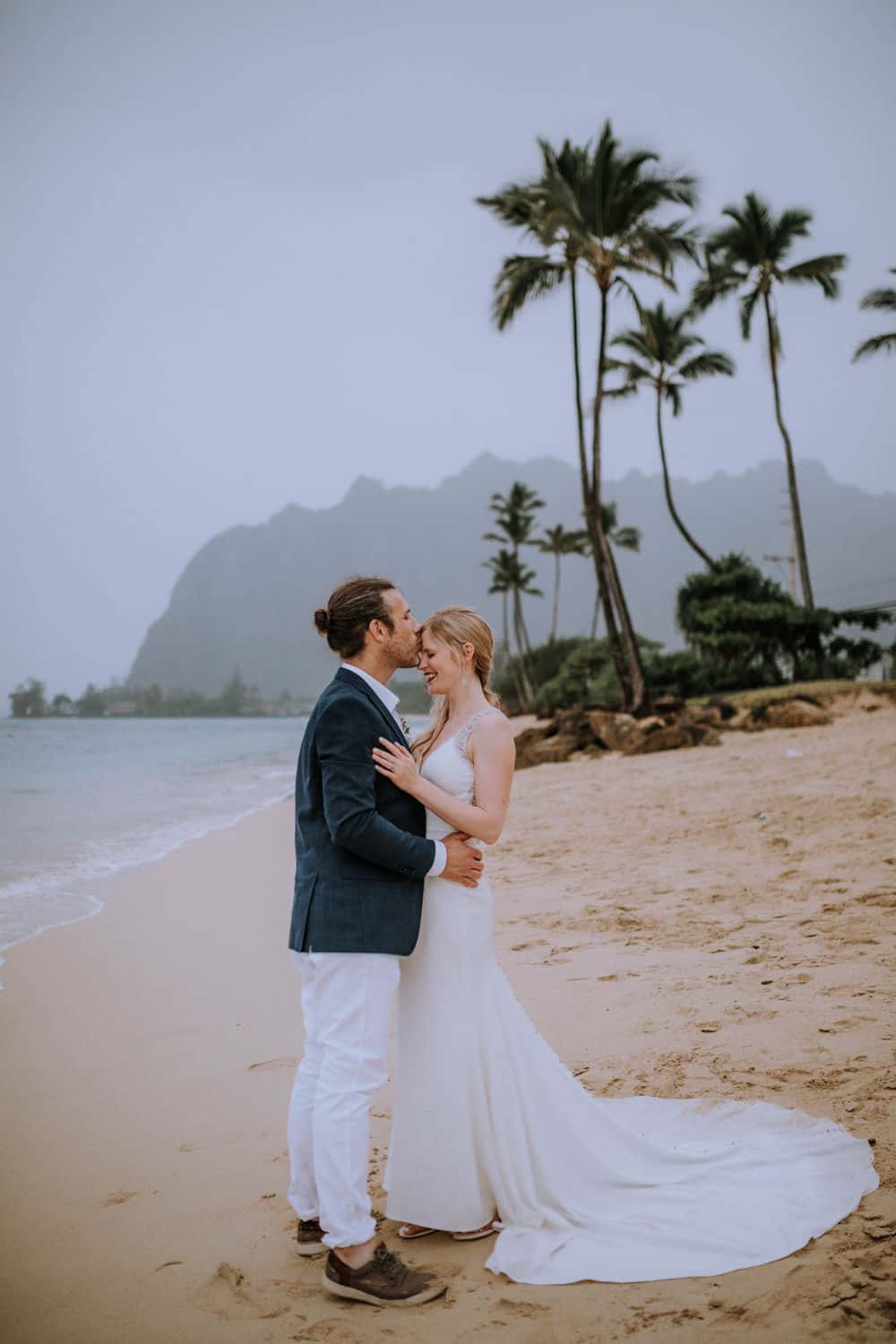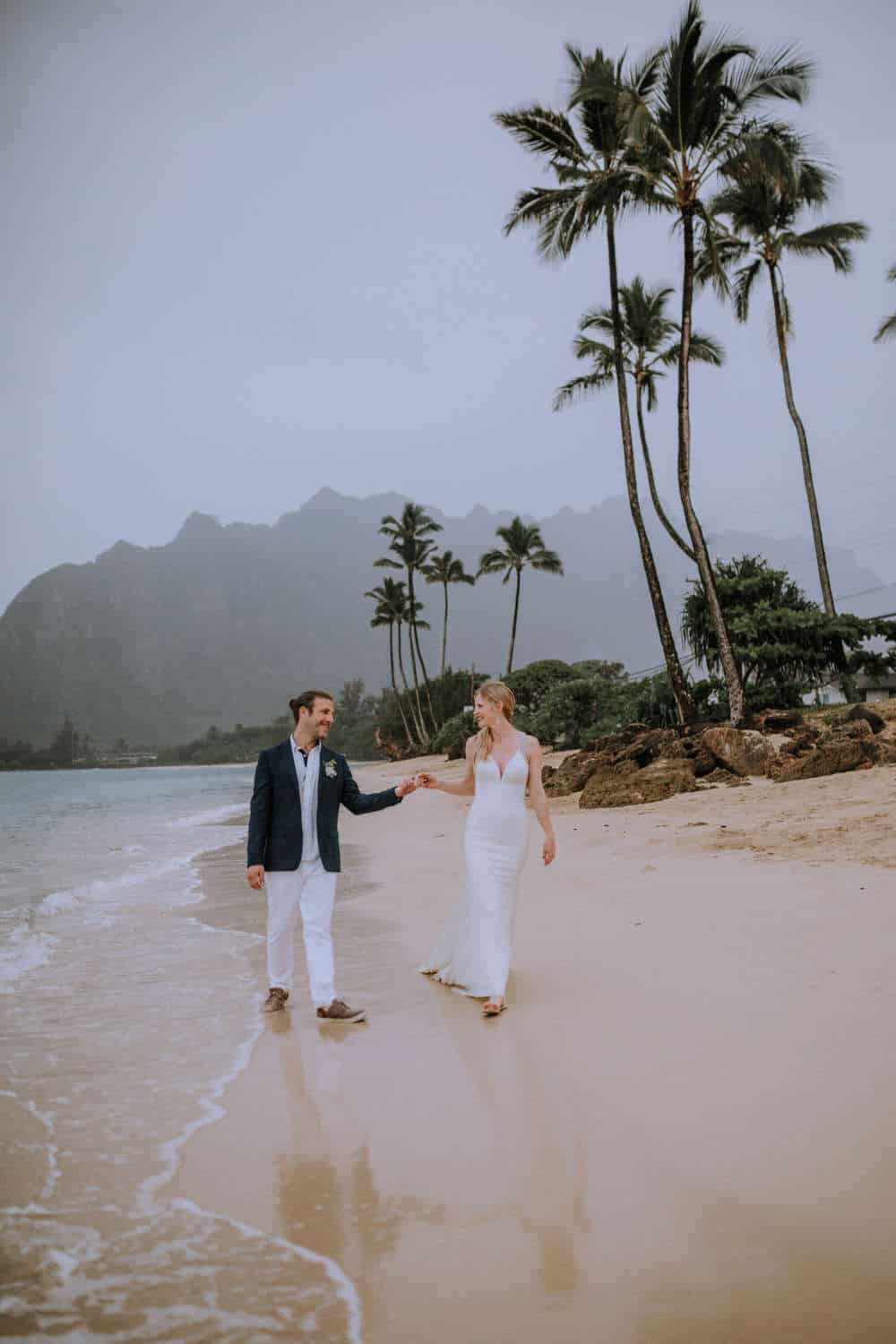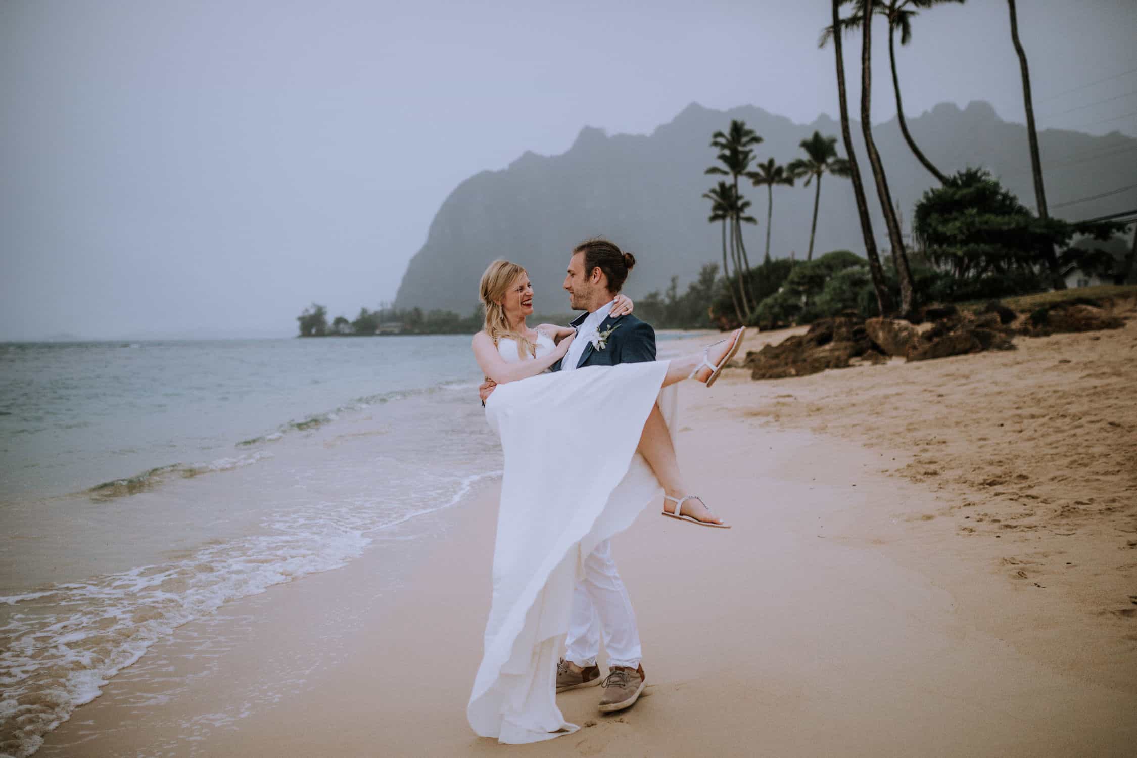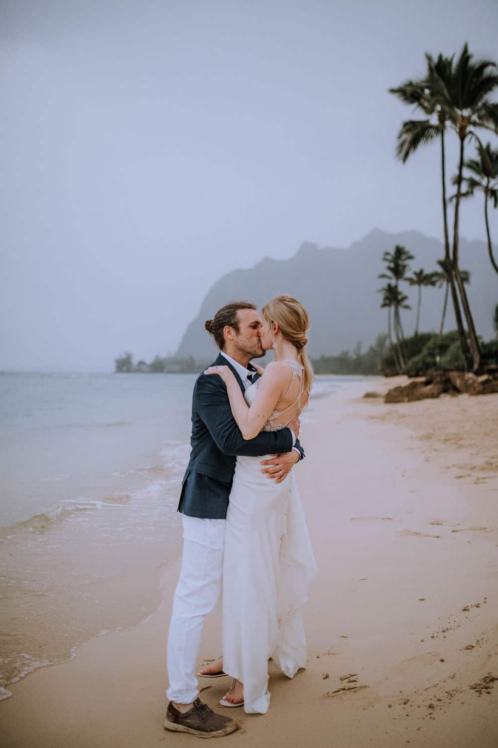 Having this all come together after planning for so long was such a dream come true for these lovers! They had friends & family travel from afar to witness their Elopement at a private home in Kaaawa. Stefanie & Joseph were a super laid back couple, down for whatever, wanted to head to the beach for photos in the pouring rain and had drinks + a dance party with their guests!