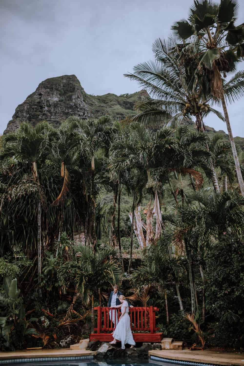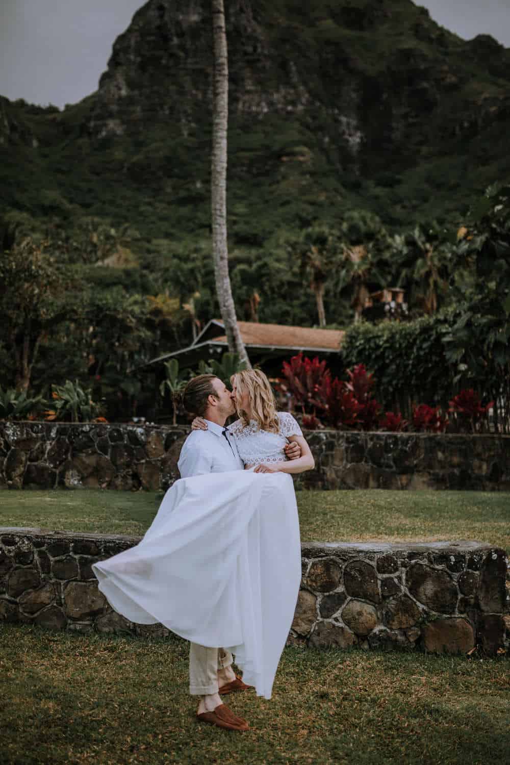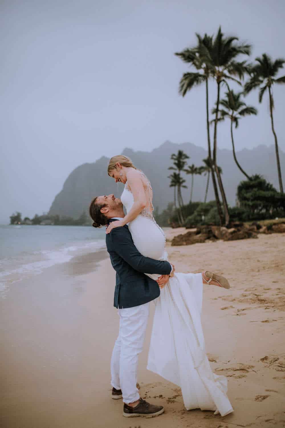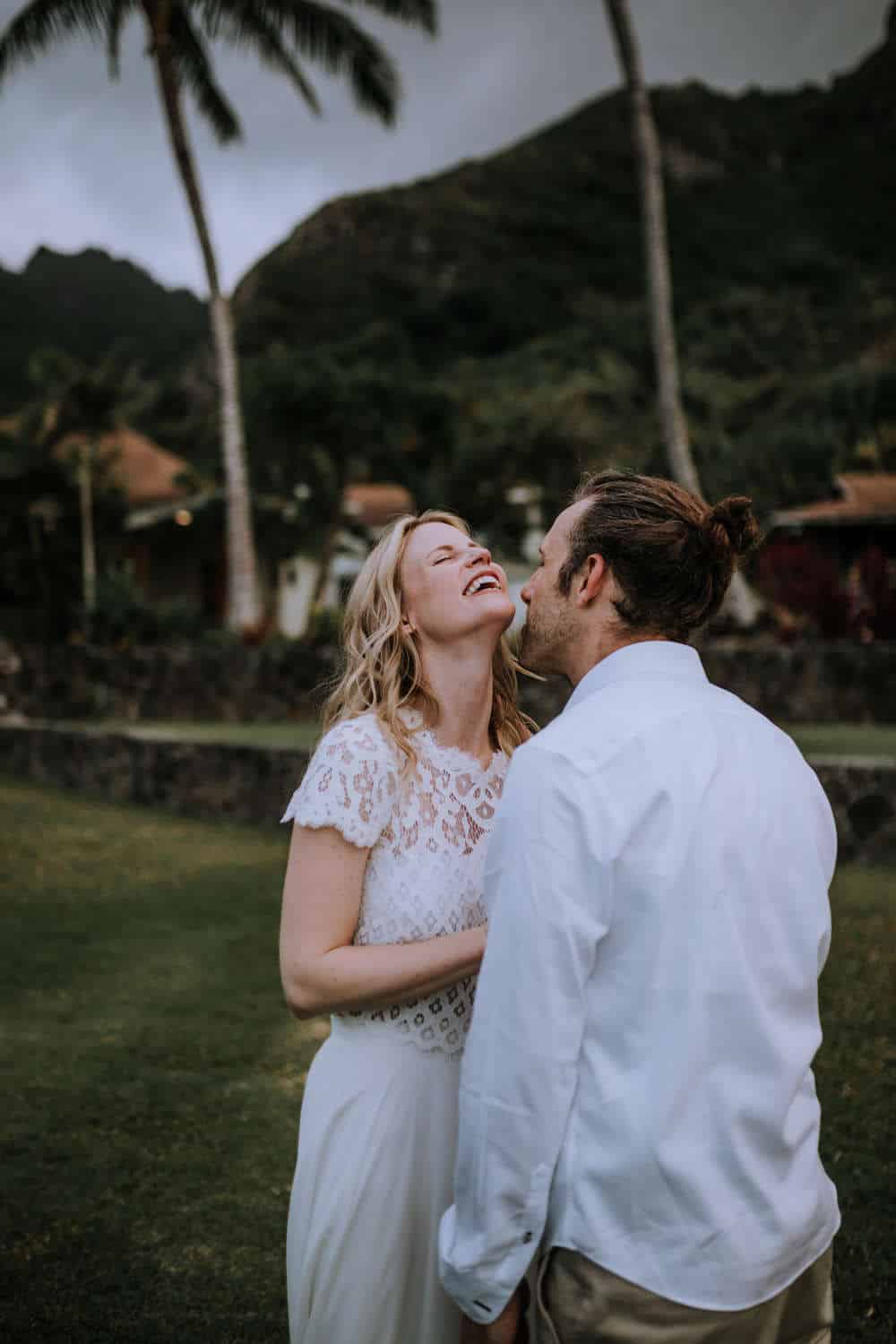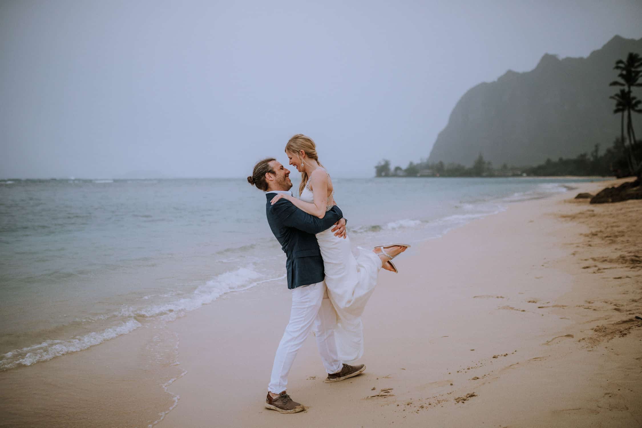 Having this all come together after planning for so long was such a dream come true for these lovers! They had friends & family travel from afar to witness their Elopement at a private home in Kaaawa. Stefanie & Joseph were a super laid back couple, down for whatever, wanted to head to the beach for photos in the pouring rain and had drinks + a dance party with their guests!