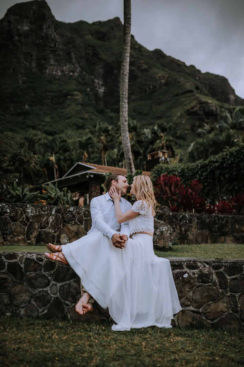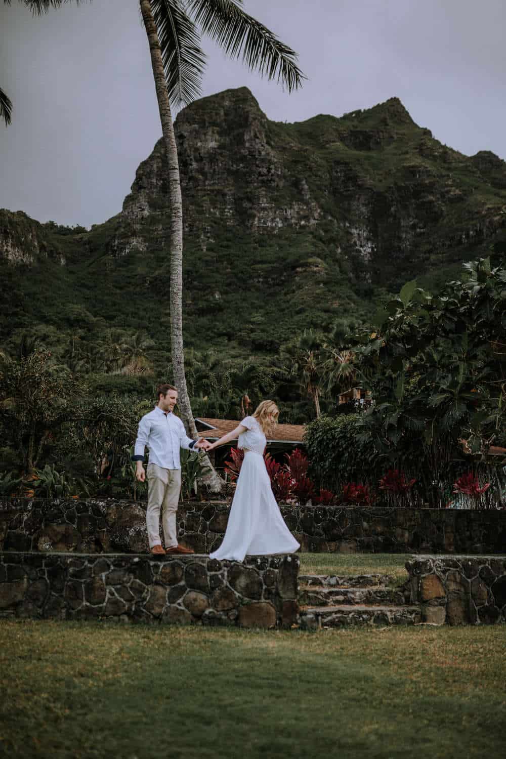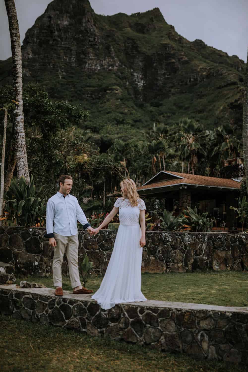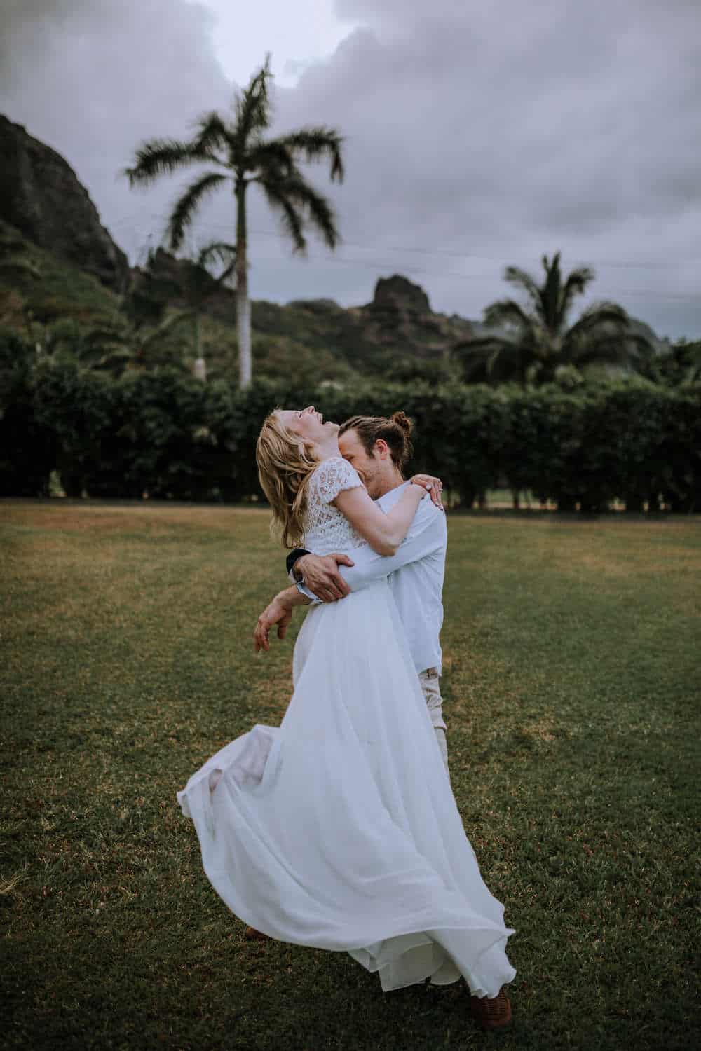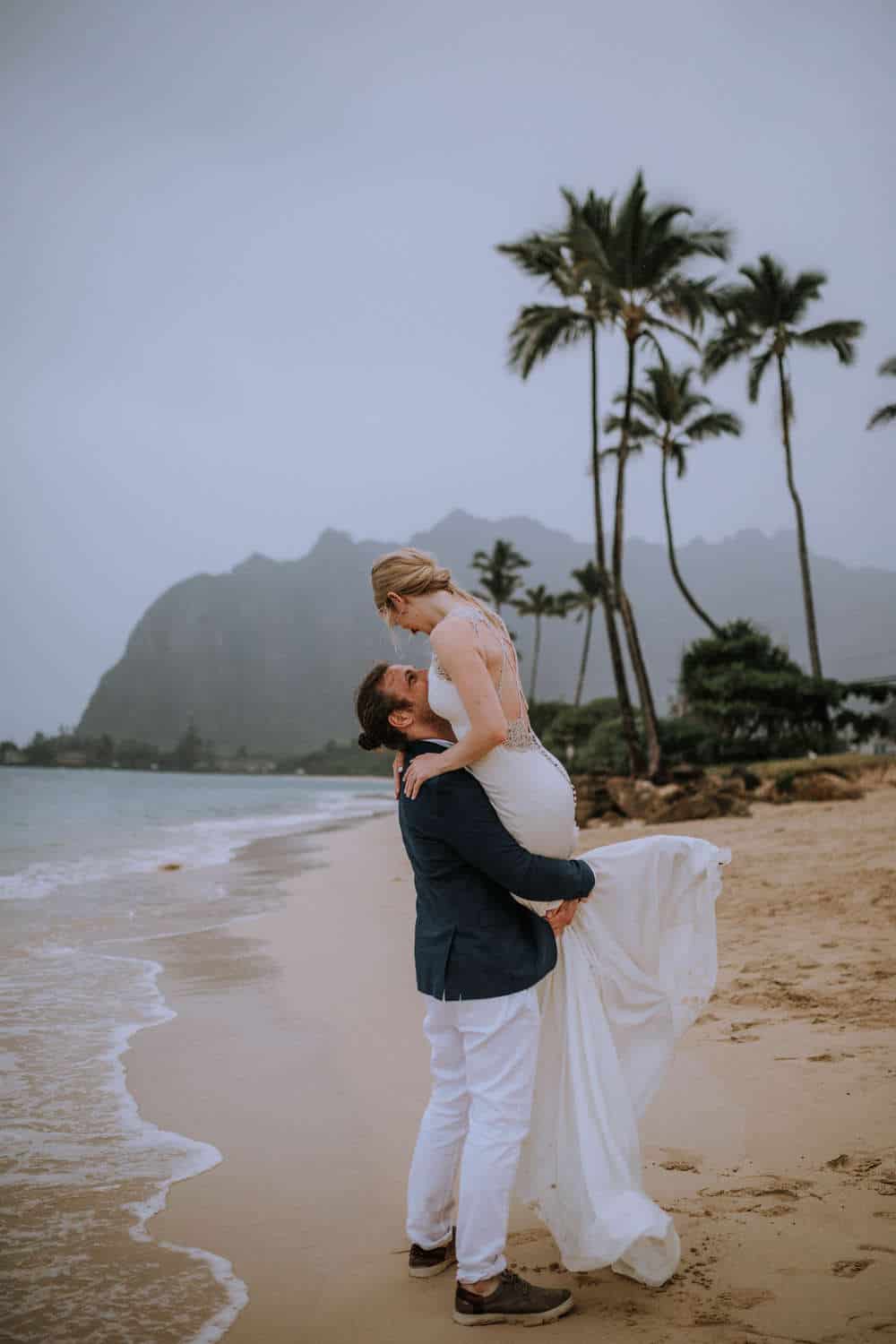 Having this all come together after planning for so long was such a dream come true for these lovers! They had friends & family travel from afar to witness their Elopement at a private home in Kaaawa. Stefanie & Joseph were a super laid back couple, down for whatever, wanted to head to the beach for photos in the pouring rain and had drinks + a dance party with their guests!