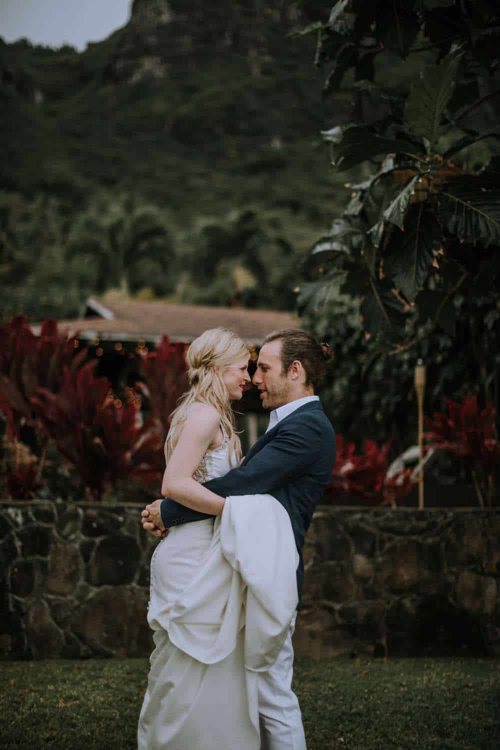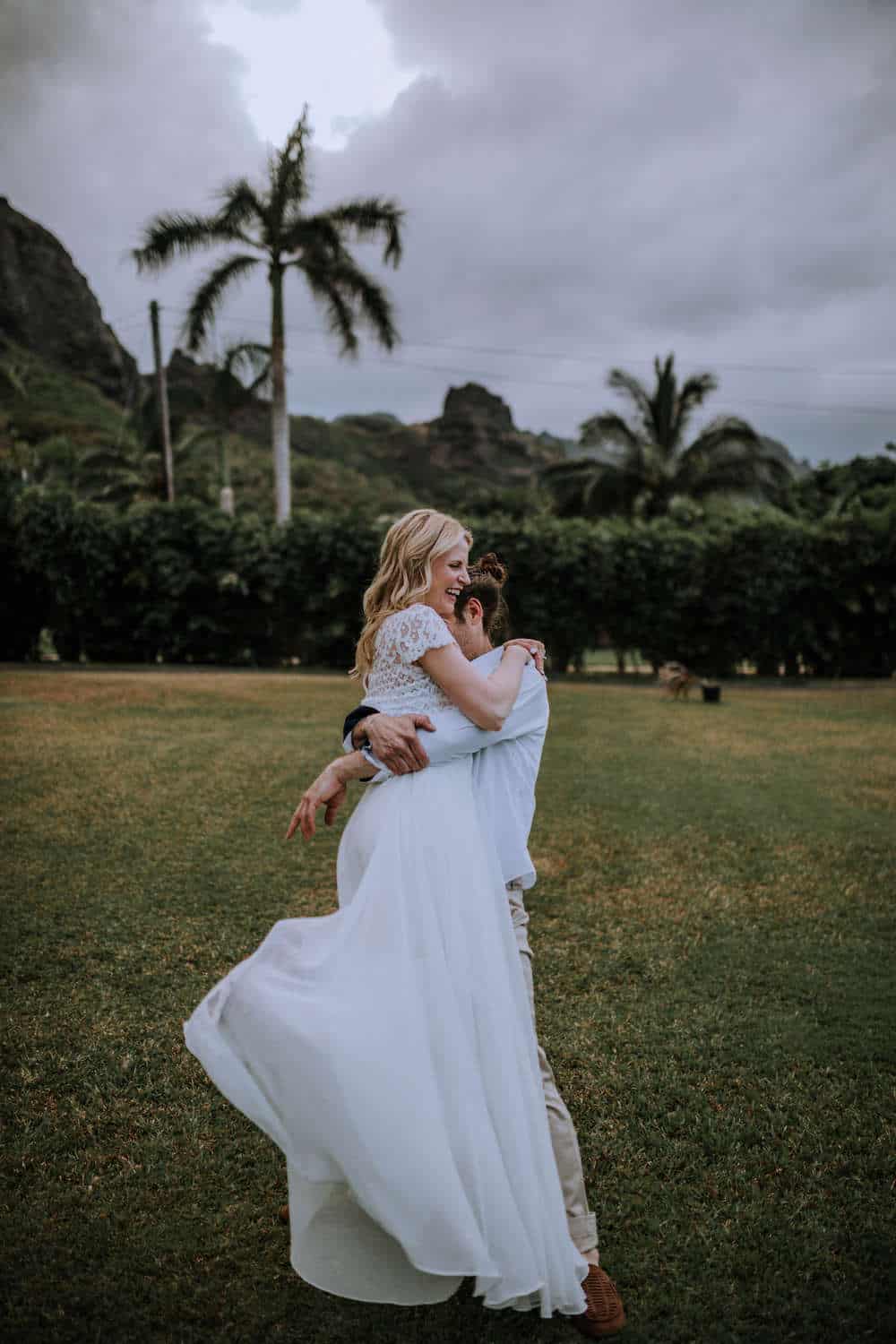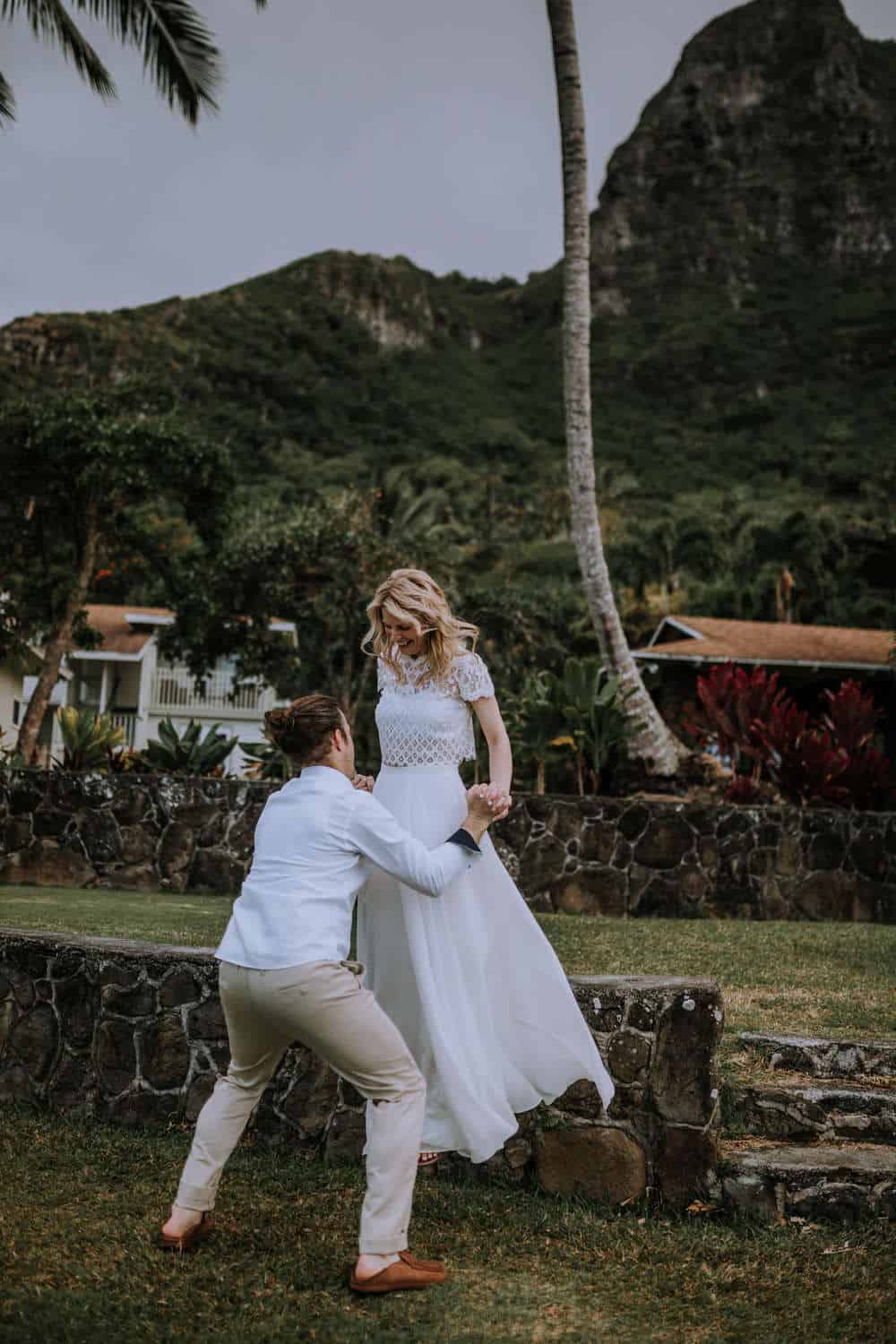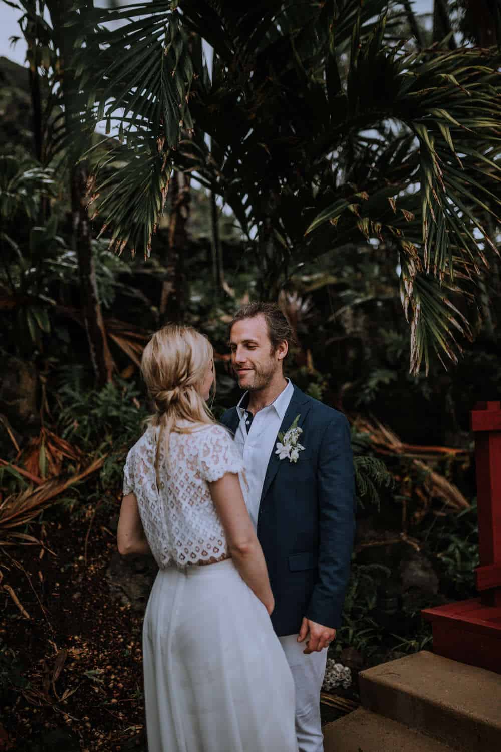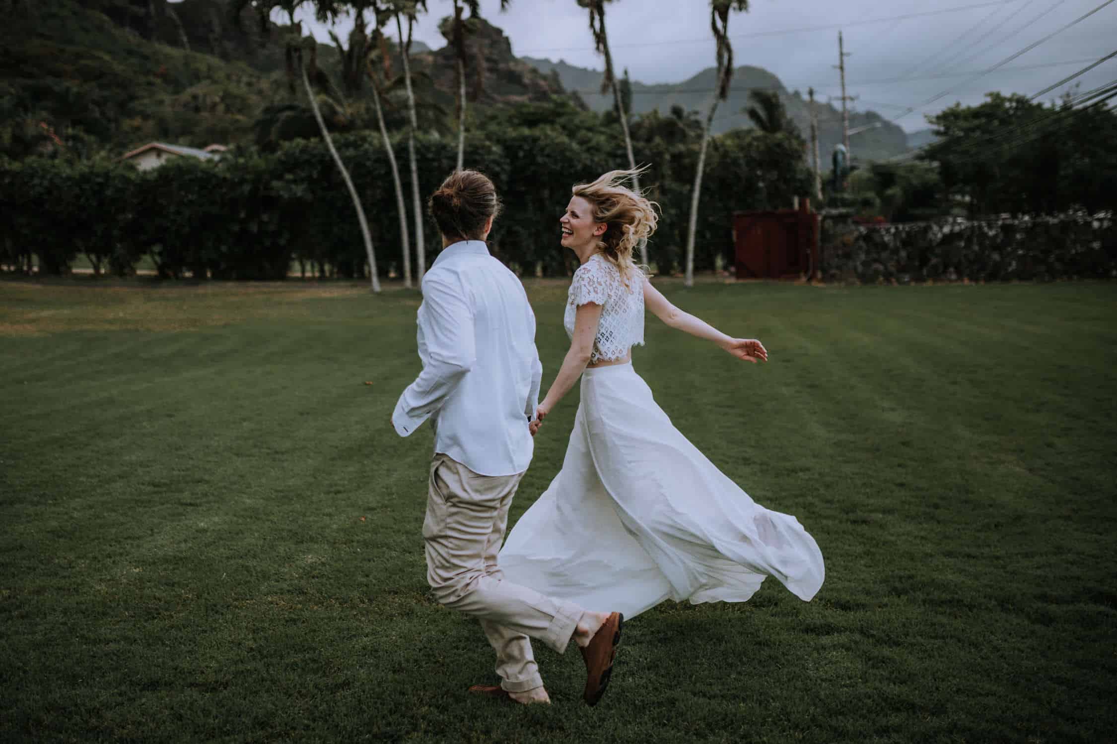 Having this all come together after planning for so long was such a dream come true for these lovers! They had friends & family travel from afar to witness their Elopement at a private home in Kaaawa. Stefanie & Joseph were a super laid back couple, down for whatever, wanted to head to the beach for photos in the pouring rain and had drinks + a dance party with their guests!