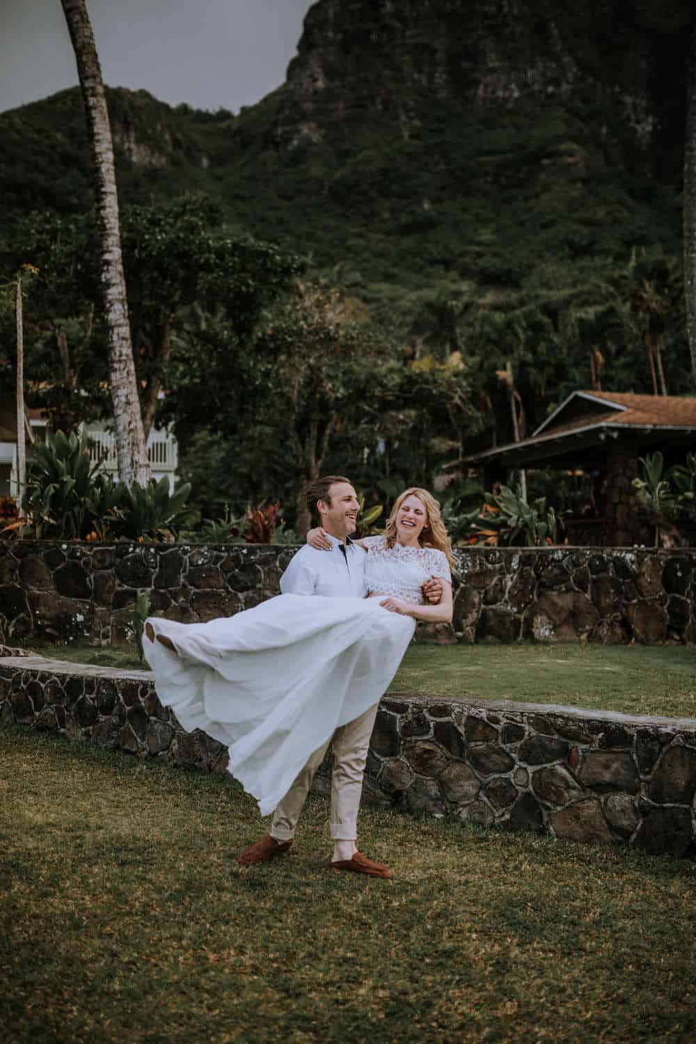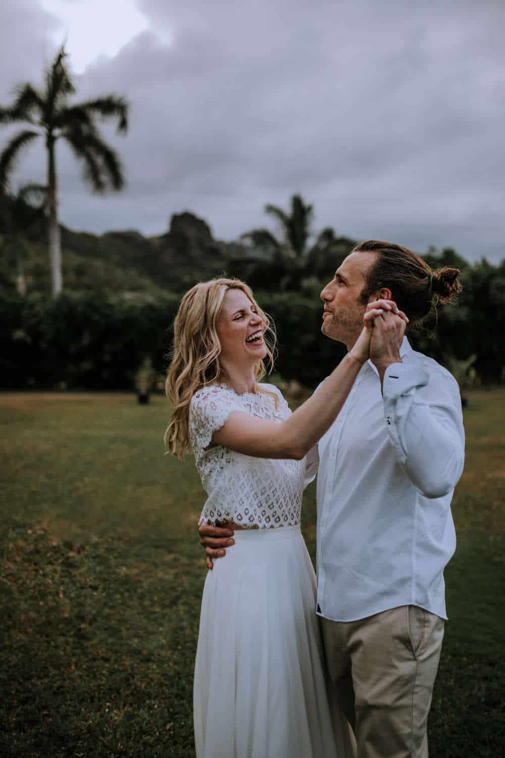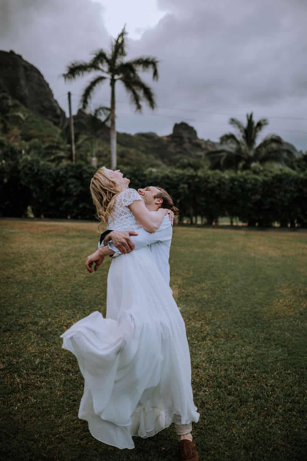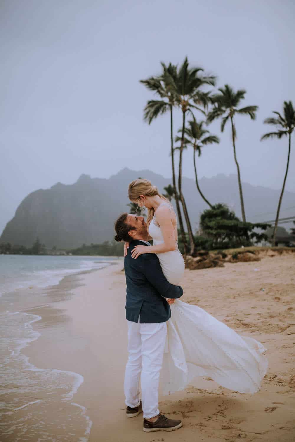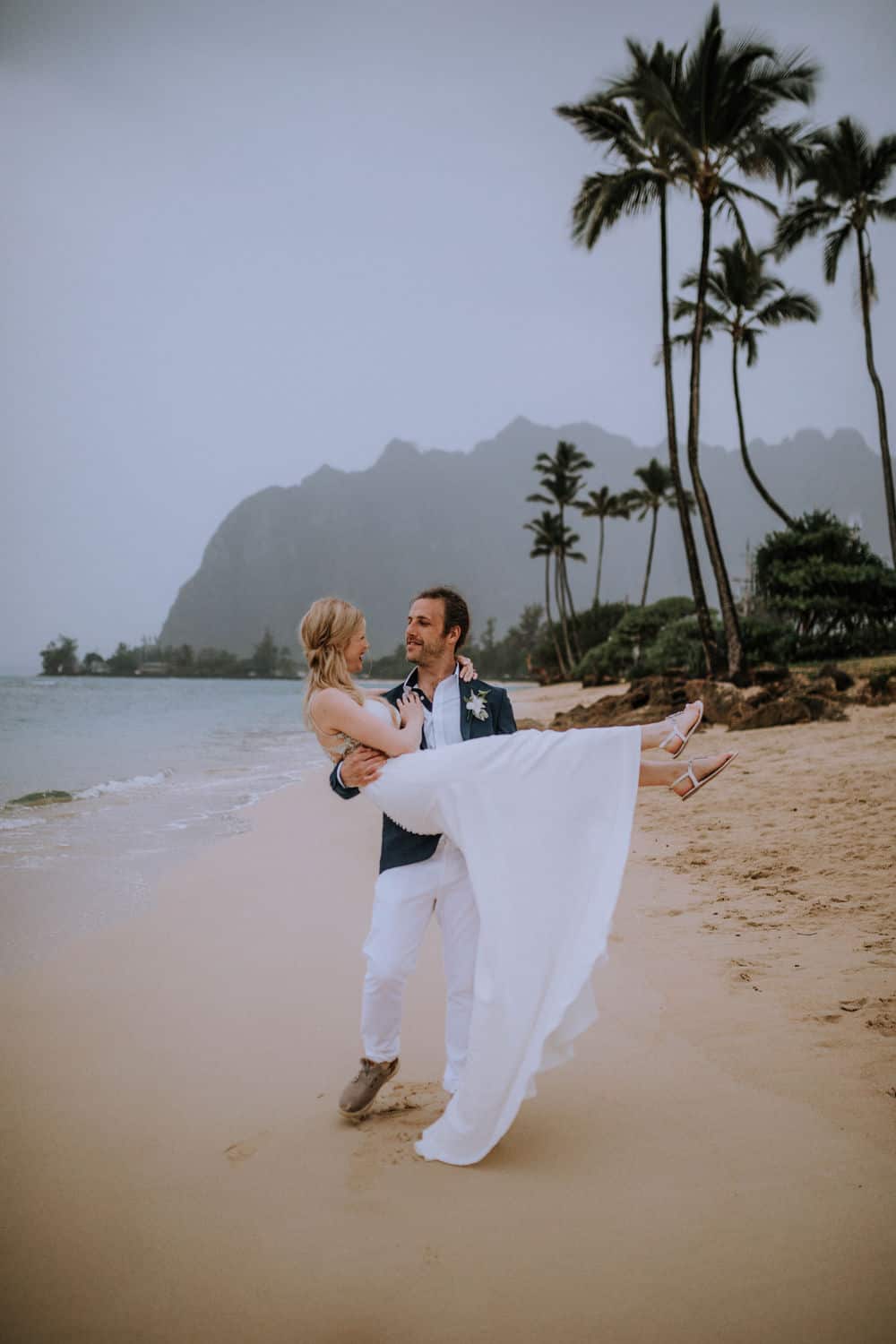 Having this all come together after planning for so long was such a dream come true for these lovers! They had friends & family travel from afar to witness their Elopement at a private home in Kaaawa. Stefanie & Joseph were a super laid back couple, down for whatever, wanted to head to the beach for photos in the pouring rain and had drinks + a dance party with their guests!